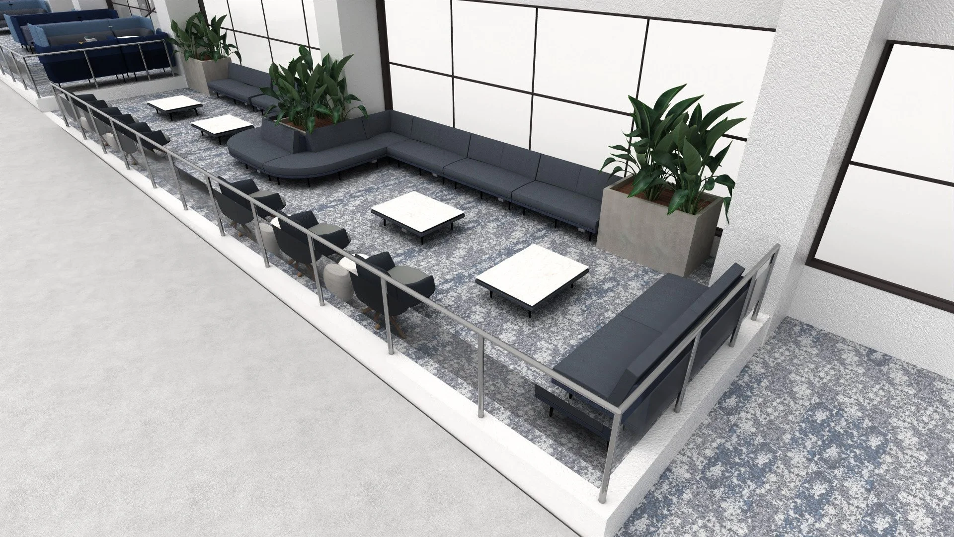 The seating zones are designed to accommodate a range of traveler needs from quick touch‑down moments to longer layovers. Modular lounge furniture, soft curved configurations, and upholstered benches provide inviting options for individuals or small groups. Integrated tables offer convenient surfaces for work and personal devices, supporting productivity on the go.