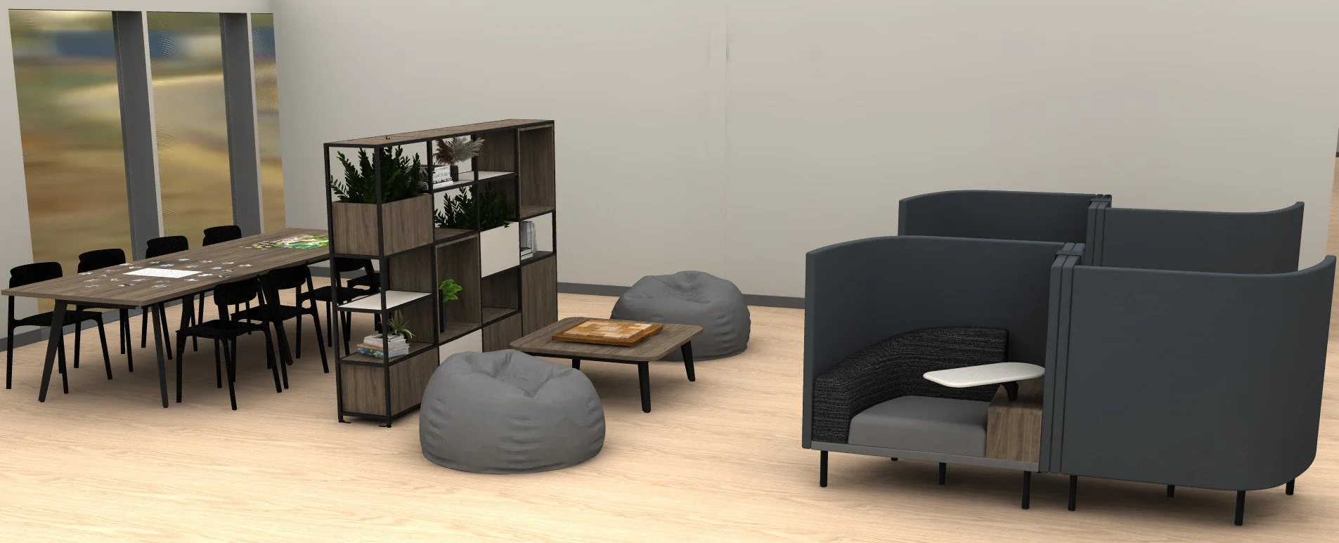 We transformed this nonprofit’s traditional office layout into a warm, community‑focused space built for connection and collaboration. Dark, cool‑toned woods pair with black metal details to create a modern, grounded palette that feels both refined and completely approachable.