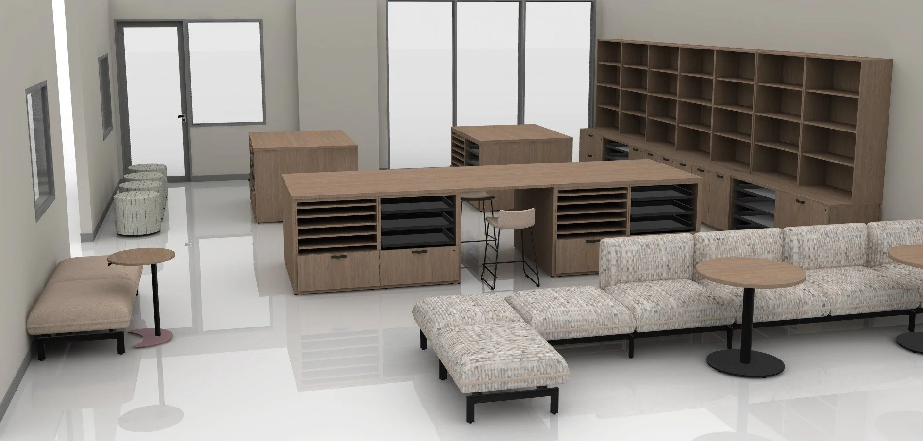 The casework solutions were built around specific storage needs, integrating open shelving, concealed cabinetry, and modular components that support organization and daily operations. Warm wood tones and patterned upholstery add visual interest, while durable surfaces ensure longevity in a high‑traffic environment.